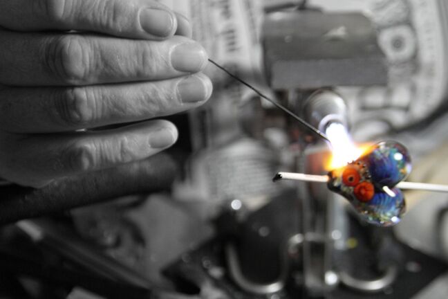 In meiner Werkstatt entsteht an meinem Perlenbrenner jede einzelne Glasperle für meinen handgemachten Glasschmuck. Die Glasstange wird langsam erhitzt und behutsam um einen mit Trennmittel beschichteten Stahlstab gewickelt. So bildet sich die Grundform der Perle, die anschließend mit viel Liebe zum Detail weiterverziert wird. Auf diese Weise entstehen meine charakteristischen Lampwork Perlen, die später den besonderen Charakter meines Glasperlen Schmucks ausmachen.